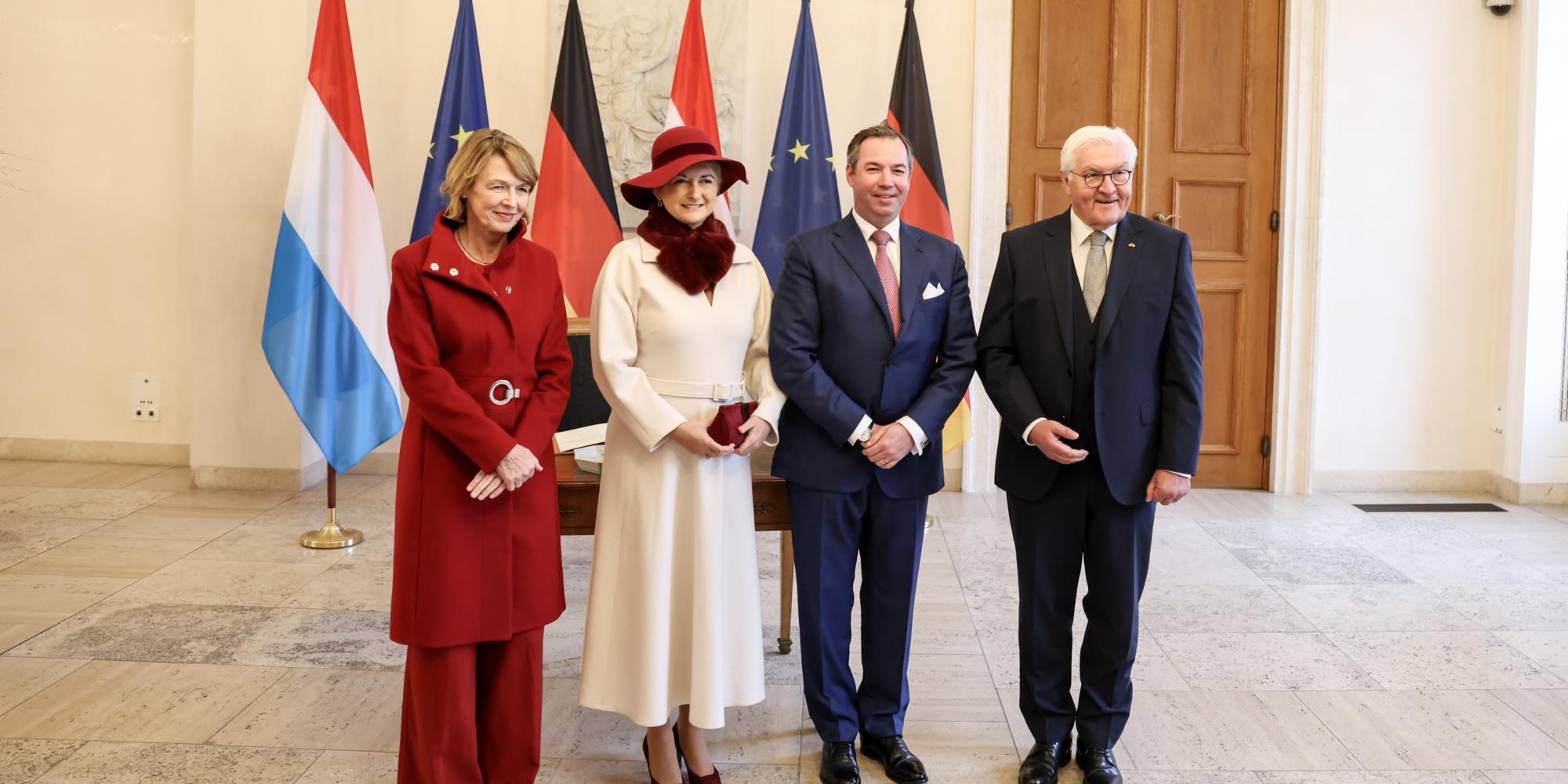 🇱🇺 Nom Trounwiessel, waren de Grand-Duc an d'Grande-Duchesse, begleet vum Xavier Bettel, Vizepremierminister, Minister fir auswäerteg Ugeleeënheeten an Aussenhandel, de 27. Oktober 2025 fir eng Visitt an Däitschland. Zu Berlin goufe si am Schlass Bellevue vum Bundespräsident Frank-Walter Steinmeier a senger Fra Elke Büdenbender empfaangen. 🇫🇷 Suite à l'avènement au trône, LL.AA.RR. le Grand-Duc et la Grande-Duchesse, accompagnées de Xavier Bettel, Vice-Premier ministre, ministre des Affaires étrangères et du Commerce extérieur, se sont rendues en Allemagne pour une visite de courtoisie le 27 octobre 2025. À Berlin, ils ont été accueillis au château de Bellevue par le président de la République fédérale d’Allemagne, Frank-Walter-Steinmeier et son épouse, Elke Büdenbender. 🇬🇧 Following the Accession to the Throne, TRH the Grand Duke and the Grand Duchess, accompanied by Xavier Bettel, Deputy Prime Minister, Minister for Foreign Affairs and Foreign Trade, paid a courtesy visit to Germany on Monday, 27 October 2025. In Berlin, they were welcomed at Bellevue Palace by the President of the Federal Republic of Germany, Frank-Walter Steinmeier, and his wife, Elke Büdenbender. 🇩🇪 Following the Accession to the Throne, TRH the Grand Duke and the Grand Duchess, accompanied by Xavier Bettel, Deputy Prime Minister, Minister for Foreign Affairs and Foreign Trade, paid a courtesy visit to Germany on Monday, 27 October 2025. In Berlin, they were welcomed at Bellevue Palace by the President of the Federal Republic of Germany, Frank-Walter Steinmeier, and his wife, Elke Büdenbender. ➡ www.gouvernement.lu #gouvernementLU | Cour Grand-Ducale | Xavier Bettel 📸 © SIP / Sophie Margue