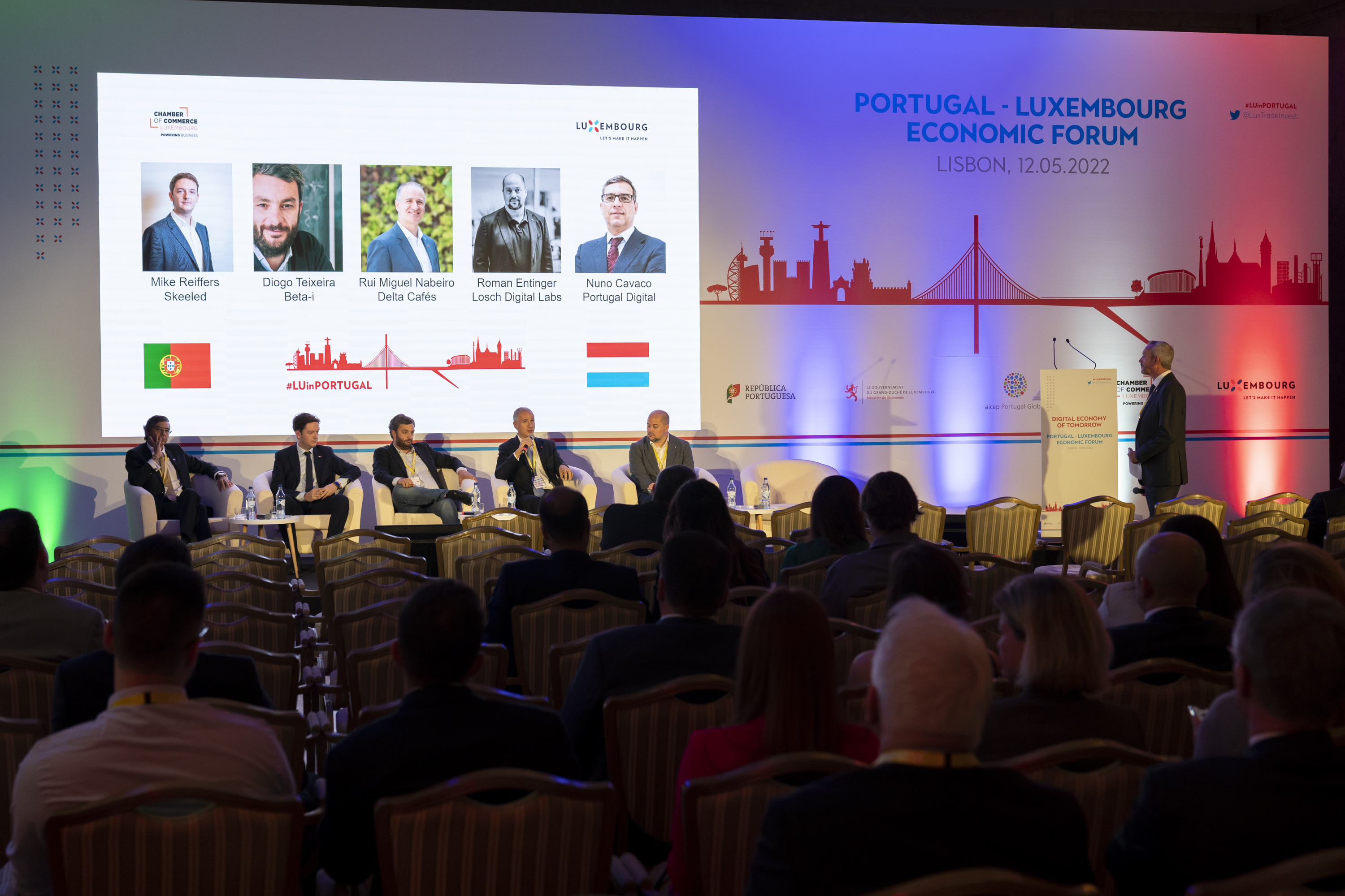 Das Wirtschaftsforum Portugal-Luxemburg und die multisektoralen Seminare - die gemeinsam von der luxemburgischen Handelskammer und der portugiesischen Investitions- und Außenhandelsagentur (AICEP) abgehalten wurden - standen am zweiten Tag der Staatsvisite im Mittelpunkt. Auf wichtige, zukunftsträchtige Themen ausgerichtet: Digitale Wirtschaft, Raumfahrt, nachhaltiges Bauen und Tourismus, ist das Ziel dieser Seminare, die Wirtschaftsbeziehungen zwischen den beiden Ländern zu vertiefen, indem einerseits Luxemburger Unternehmen, die auf dem portugiesischen Markt Fuß fassen wollen, gefördert, und andererseits neue Beziehungen mit portugiesischen Unternehmen vereinfacht werden. Dieses Forum wurde durch die Anwesenheit des großherzoglichen Paares und des Präsidenten der Republik noch aufgewertet. S.K.H. der Großherzog und Marcelo Rebelo de Sousa hielten die Abschlussreden des Seminars, gefolgt von Beiträgen des Ministers für Wirtschaft Franz Fayot, der Ministerin der Finanzen Yuriko Backes, des Präsidenten der Handelskammer Luc Frieden und des Präsidenten der AICEP Luís Castro Henriques.