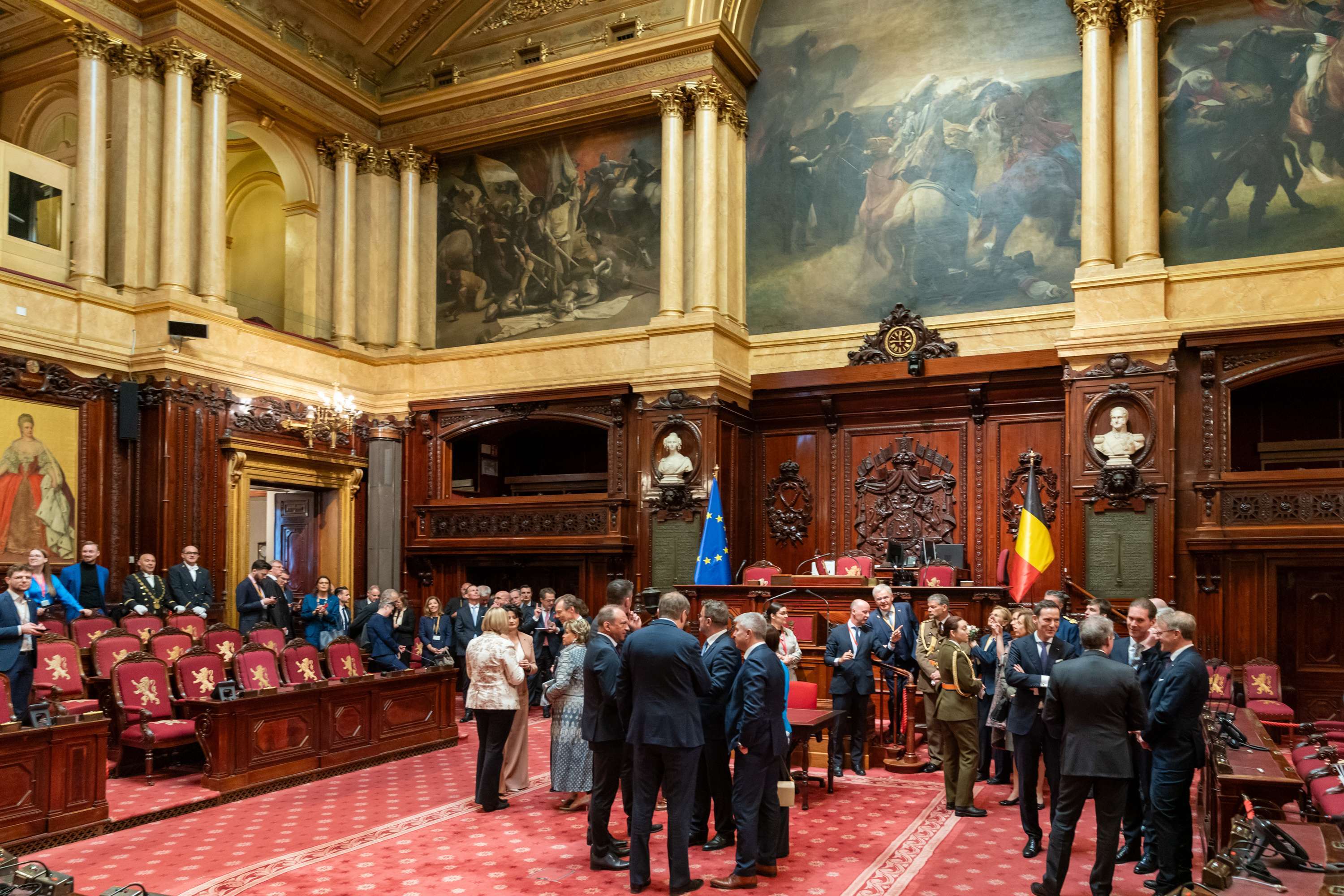 Das großherzogliche Paar und die Ministerdelegation besuchen anschließend den Palast der Nation, den Sitz des belgischen föderalen Parlaments, das aus zwei Kammern, der Abgeordnetenkammer und dem Senat, besteht. Dort treffen sie die Präsidentin des Senats, Stéphanie D'Hose, und die Präsidentin der Abgeordnetenkammer, Eliane Tillieux. Nach dem Besuch der beiden Parlamentsgebäude kehrt das großherzogliche Paar, begleitet von Xavier Bettel und Yuriko Backes, zum Königlichen Palast zurück, wo es mit dem belgischen Königspaar zu einem Mittagessen zusammenkommt.