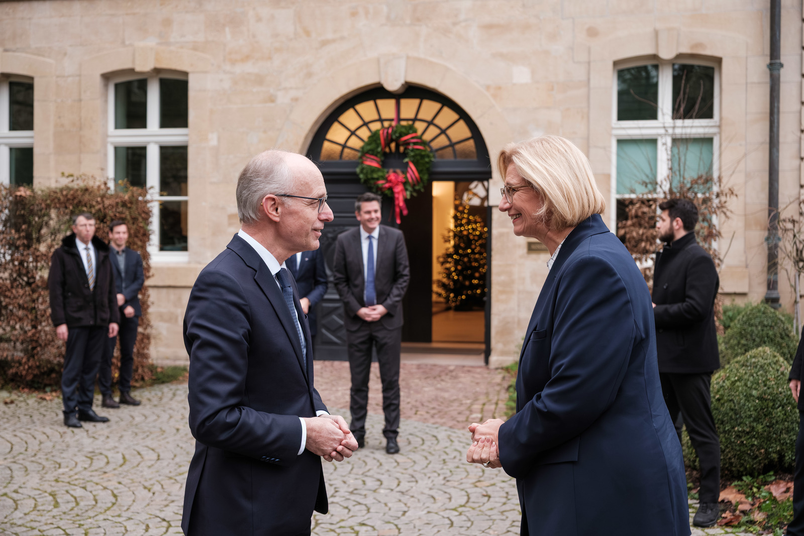 Nach der Begrüßung von Premierminister Luc Frieden fand ein Arbeitsgespräch zwischen Frau Rehlinger und dem Premierminister statt, an dem der saarländische Minister für Inneres, Bauen und Sport, Reinhold Jost, sowie der Minister für Wirtschaft, Innovation, Digitales und Energie, Jürgen Barke, teilnahmen. Auf luxemburgischer Seite waren der Minister für Wirtschaft, KMU, Energie und Tourismus, Lex Delles, sowie der Minister für Innere Angelegenheiten, Léon Gloden, dabei.