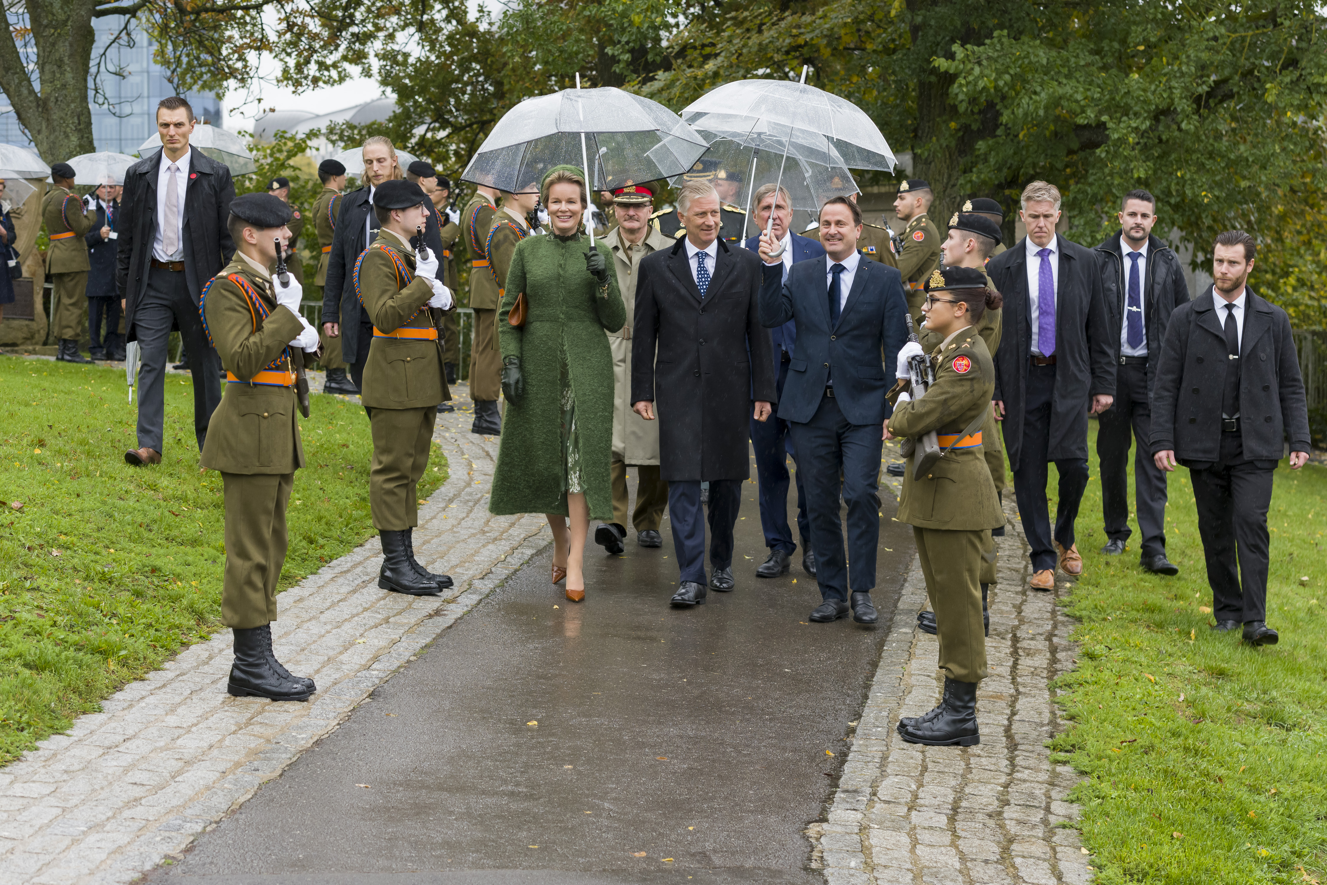 Le dépôt d'une couronne de fleurs au monument national de la Solidarité luxembourgeoise par le chef d'État belge et son épouse, du Premier ministre, ministre d'État, Xavier Bettel, du Vice-Premier ministre, ministre de la Défense, François Bausch, et du chef d'état-major de l'armée, le général Alain Duschène, figurait également au programme. Ensuite, ils ont salué les porte-drapeaux, des membres du Comité pour la mémoire de la Deuxième Guerre mondiale ainsi que des représentants des mouvements et associations patriotiques. Des explications au sujet du monument ont été fournies par le chef du Service de la mémoire de la Deuxième Guerre mondiale, Jean-Claude Muller.