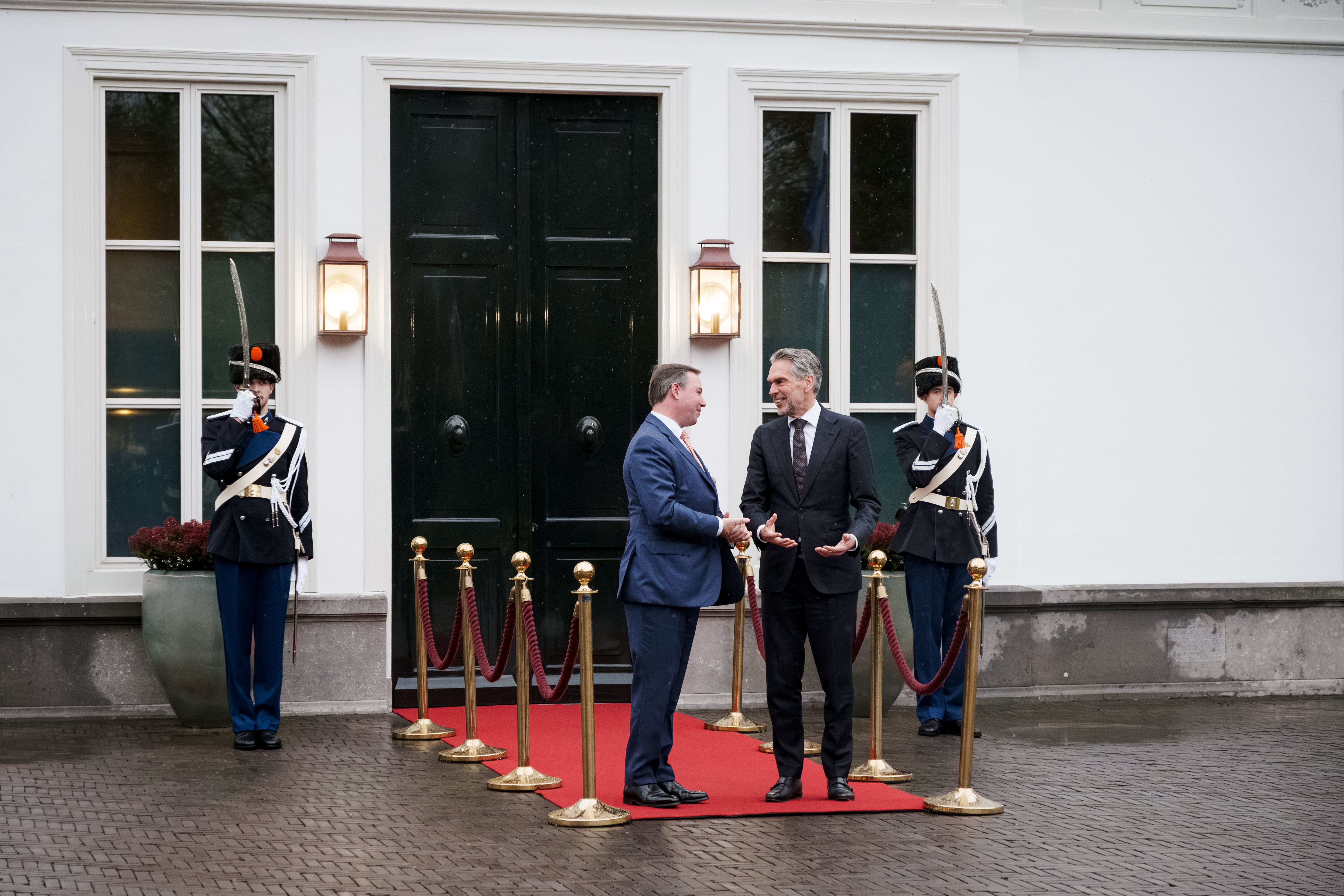 Par la suite, le chef de l'État et le ministre Xavier Bettel ont été reçus par le Premier ministre du royaume des Pays-Bas, Dick Schoof, au Catshuis pour une entrevue.