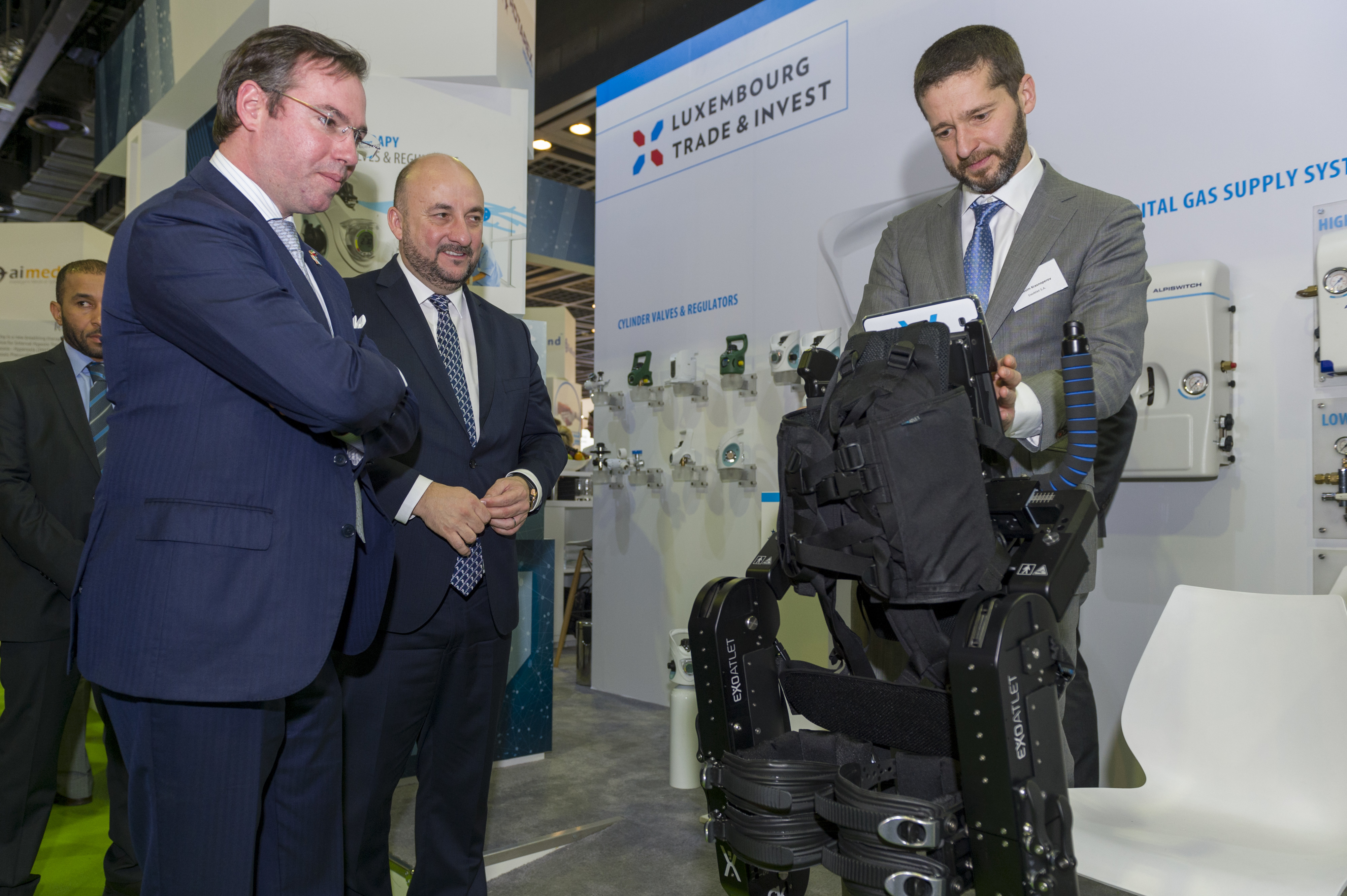 Ensuite, S.A.R. le Grand-Duc héritier et le Vice-Premier ministre, ministre de la Santé, Étienne Schneider, ont visité le pavillon luxembourgeois au salon ArabHealth de Dubaï qui est considéré comme l'une des plus importantes plateformes au monde consacrées à l'industrie des soins de santé. 6 entreprises sont présentes sur le stand luxembourgeois: Ai Mediq, BioMind, Ceodeux, ExoAtlet, IMA-X et Scipharm. Le Luxembourg en est à sa deuxième participation officielle: tout comme en 2019, la présence luxembourgeoise est conjointement organisée et financée par le ministère de l'Économie et la Chambre de commerce.