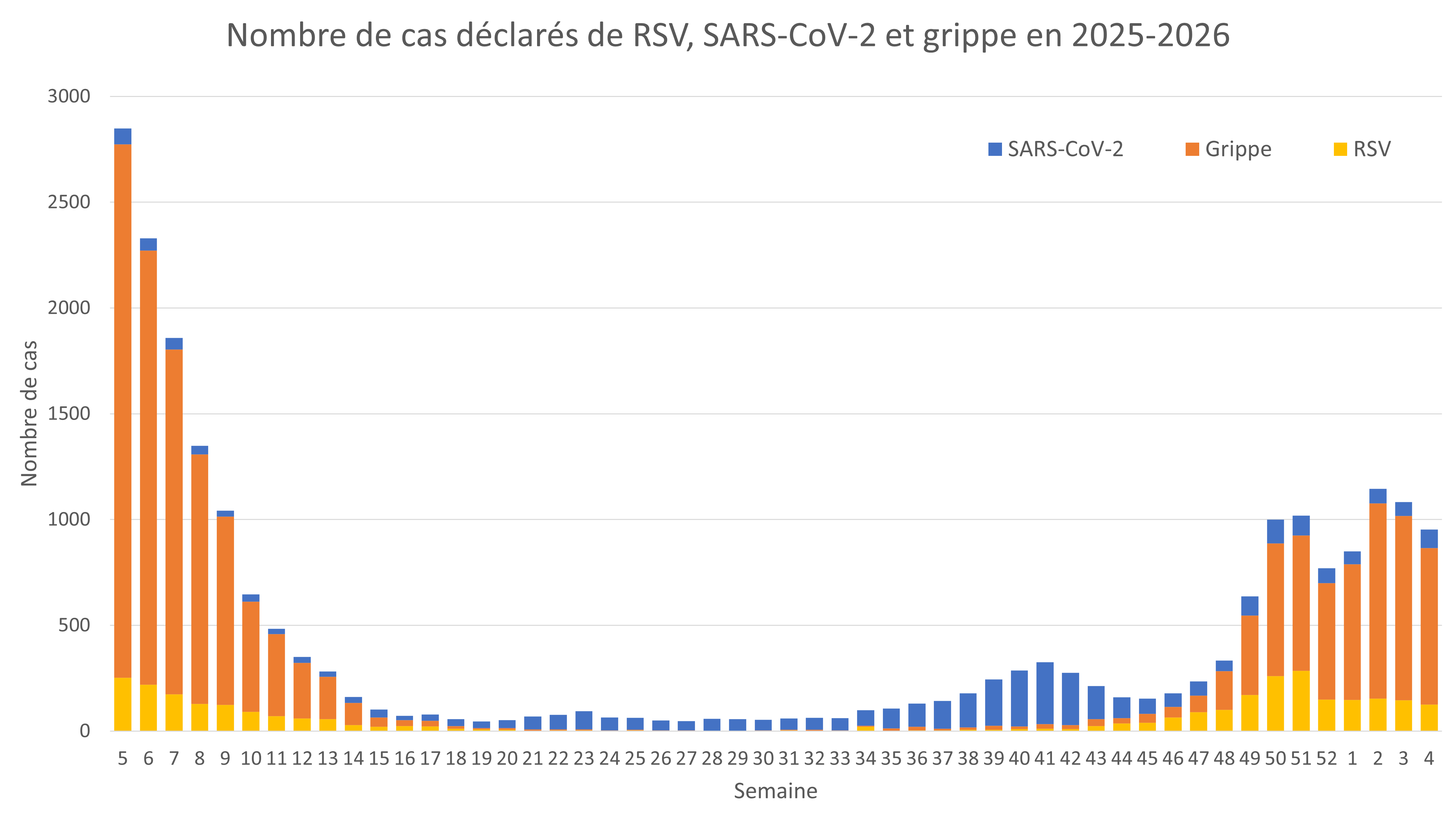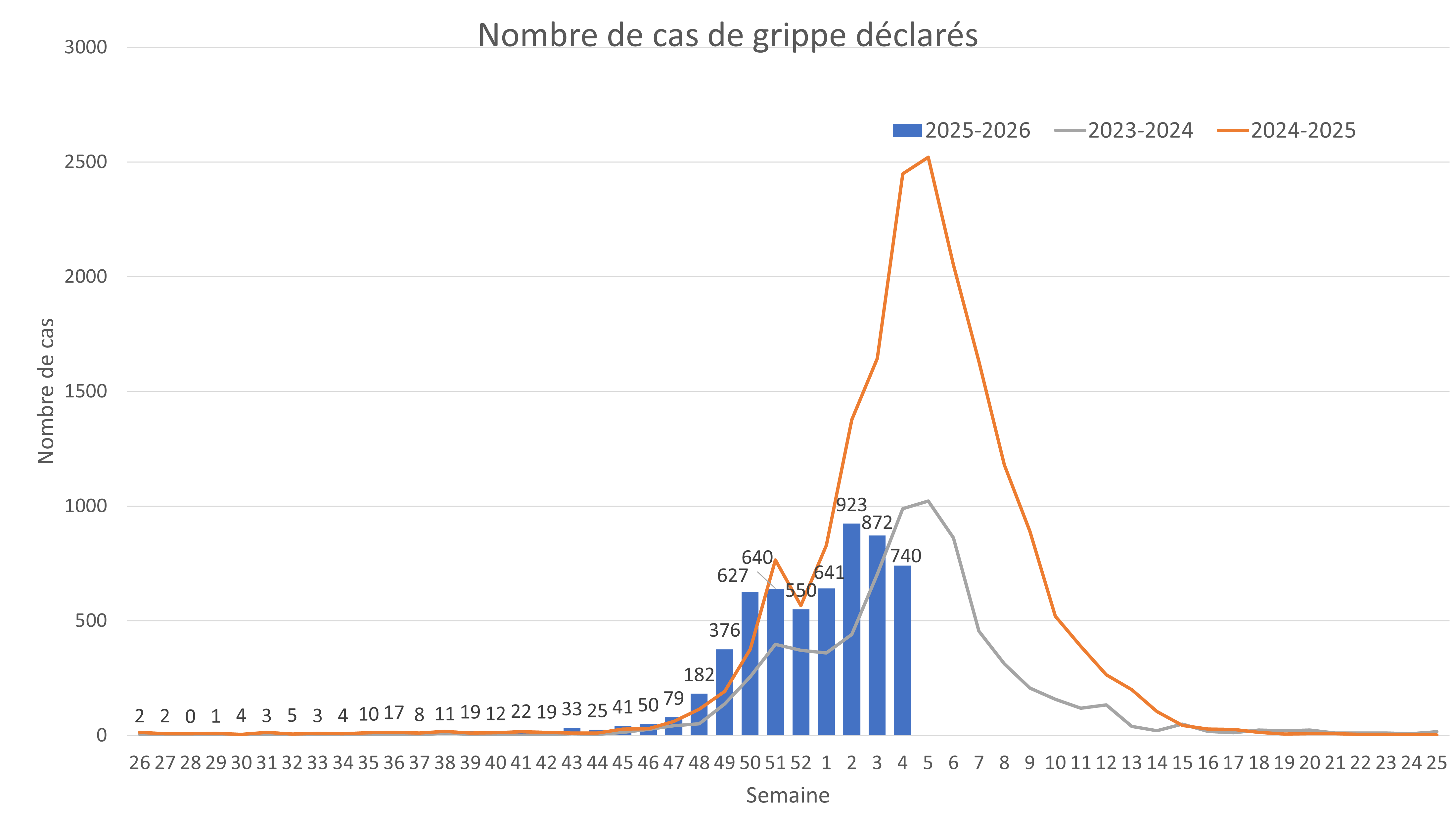 Au cours de la semaine 4, du 19 au 25 janvier 2026, le nombre de cas de grippe déclarés par les laboratoires a diminué passant de 872 à 740 cas, soit une baisse de 15% par rapport à la semaine précédente. Malgré cette deuxième semaine consécutive de recul, la circulation du virus demeure élevée.