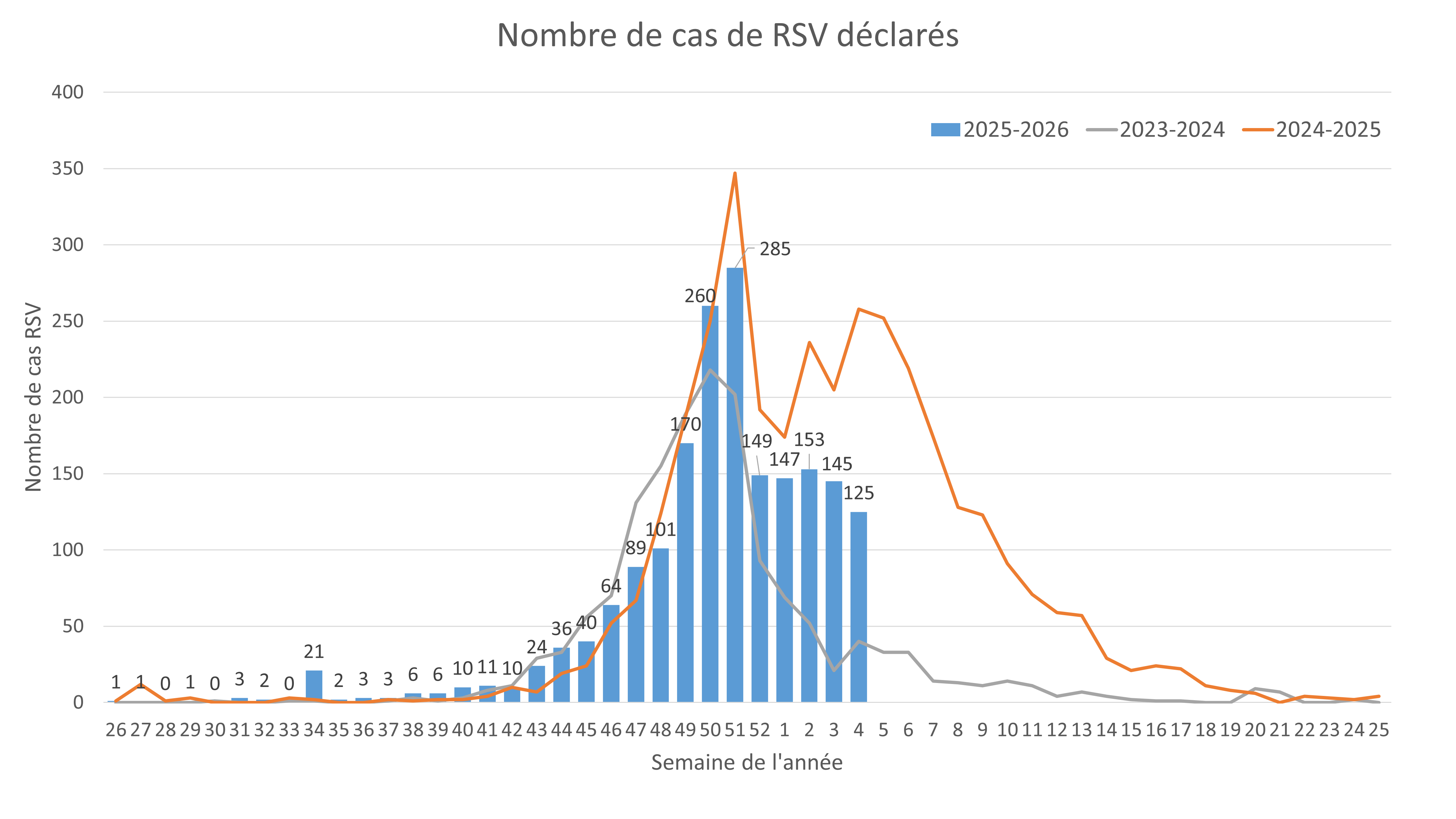 Pour le RSV, une diminution de 14% a été observée, avec 125 cas confirmés, contre 145 la semaine précédente. Depuis octobre 2025, 58% des infections concernent des enfants de moins de dix ans, ce qui indiquerait que le virus touche principalement les plus jeunes.