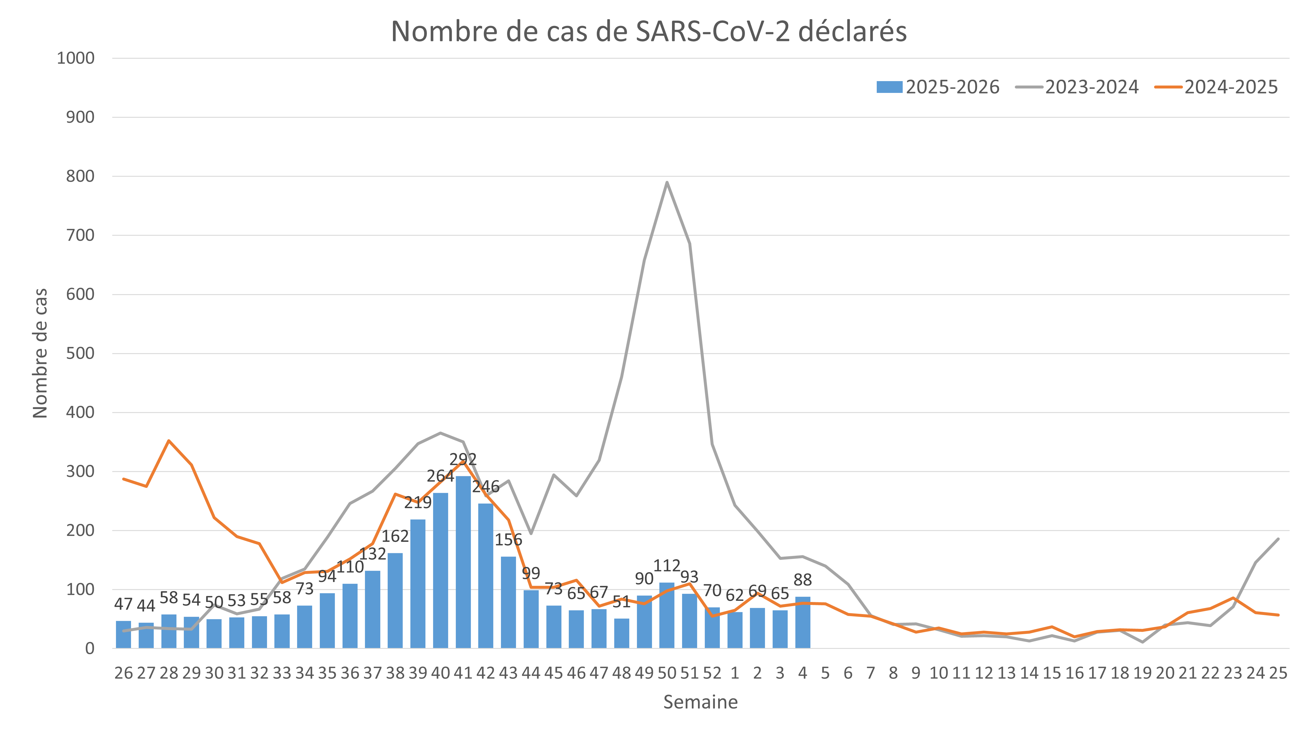 Au cours de la semaine 4, du 19 au 25 janvier 2026, le nombre de cas positifs au SARS-CoV-2 augmente, passant de 65 à 88 cas, soit une augmentation de 35% par rapport à la semaine précédente.