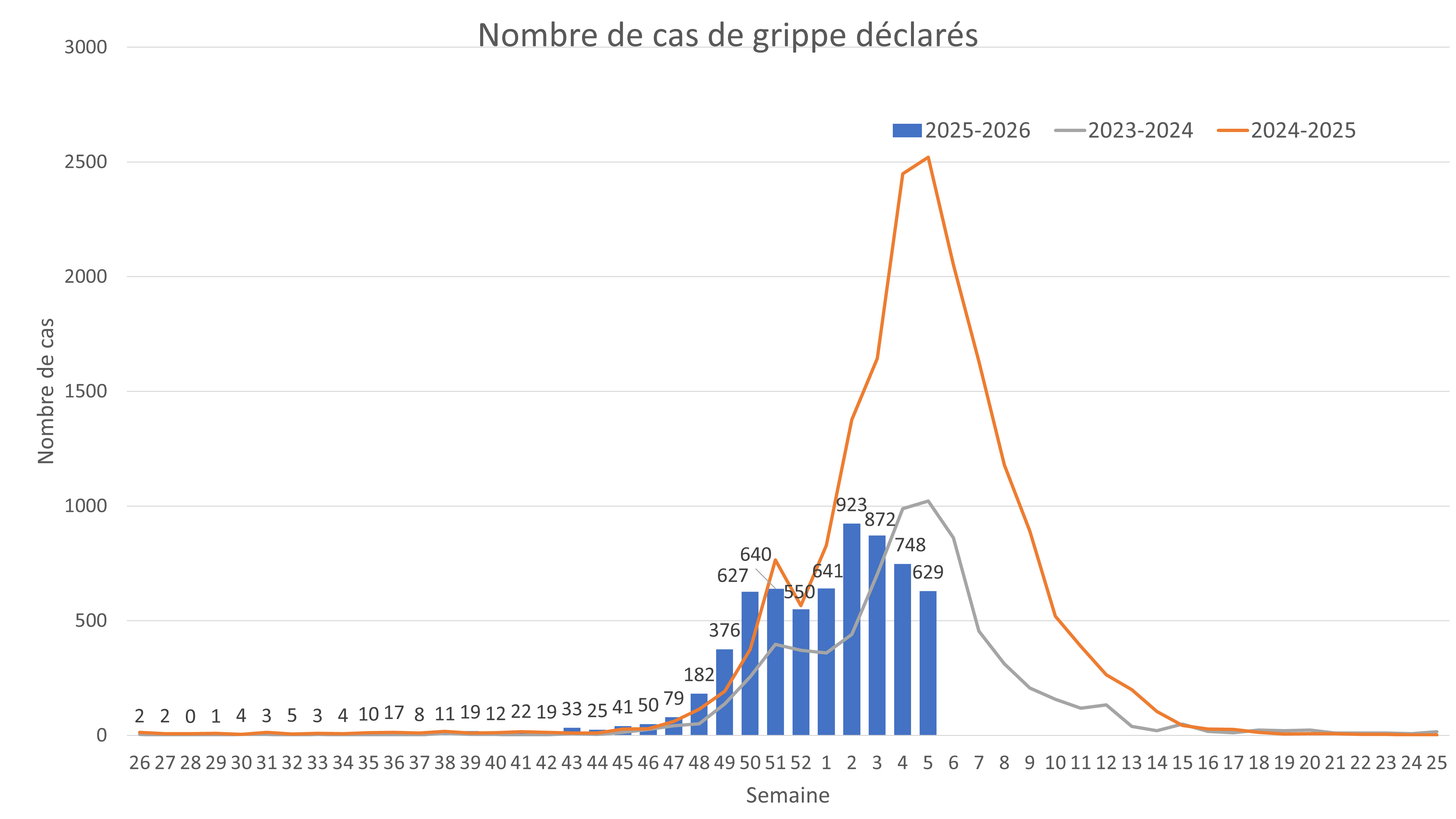 Au cours de la semaine 5, du 26 janvier au 1er février 2026, le nombre de cas de grippe déclarés par les laboratoires a diminué passant de 748 à 629 cas, soit une baisse de 16 % par rapport à la semaine précédente. Malgré cette troisième semaine consécutive de recul, la circulation du virus demeure élevée.