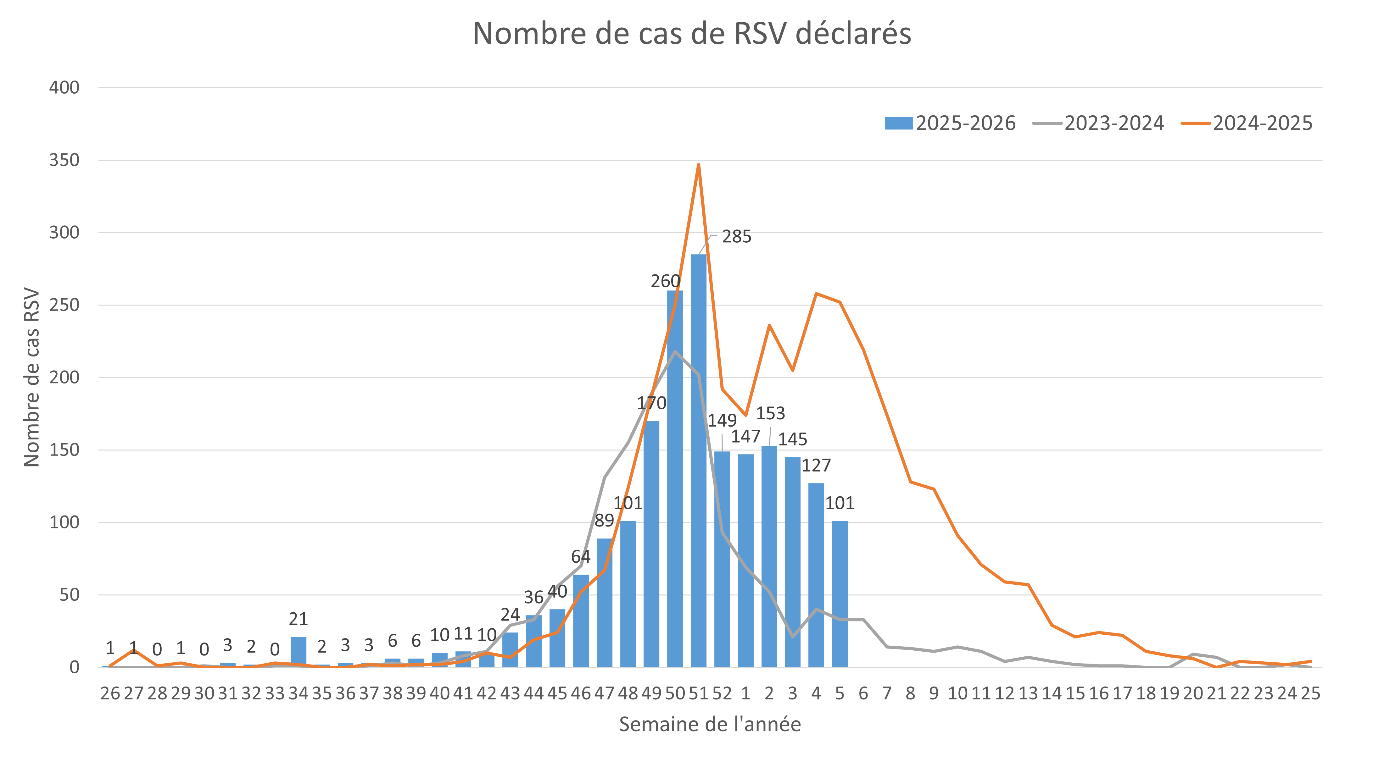 Pour le RSV, une diminution de 20 % a été observée, avec 101 cas confirmés, contre 127 la semaine précédente. Depuis octobre 2025, 56 % des infections concernent des enfants de moins de dix ans, ce qui indiquerait que le virus touche principalement les plus jeunes.