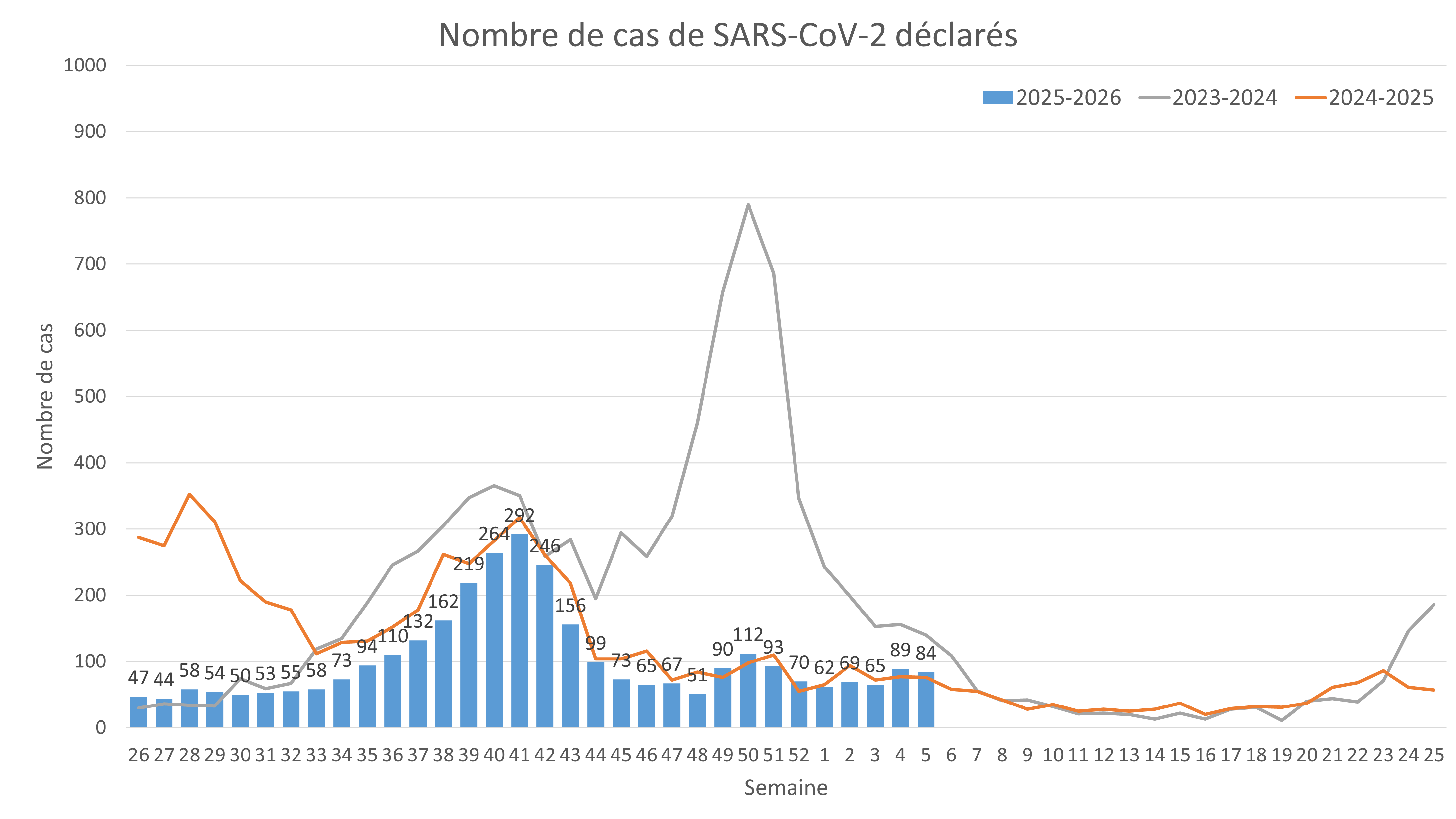 Au cours de la semaine 5, du 26 janvier au 1er février 2026, le nombre de cas positifs au SARS-CoV-2 diminue, passant de 89 à 84 cas, soit une diminution de 6 % par rapport à la semaine précédente.