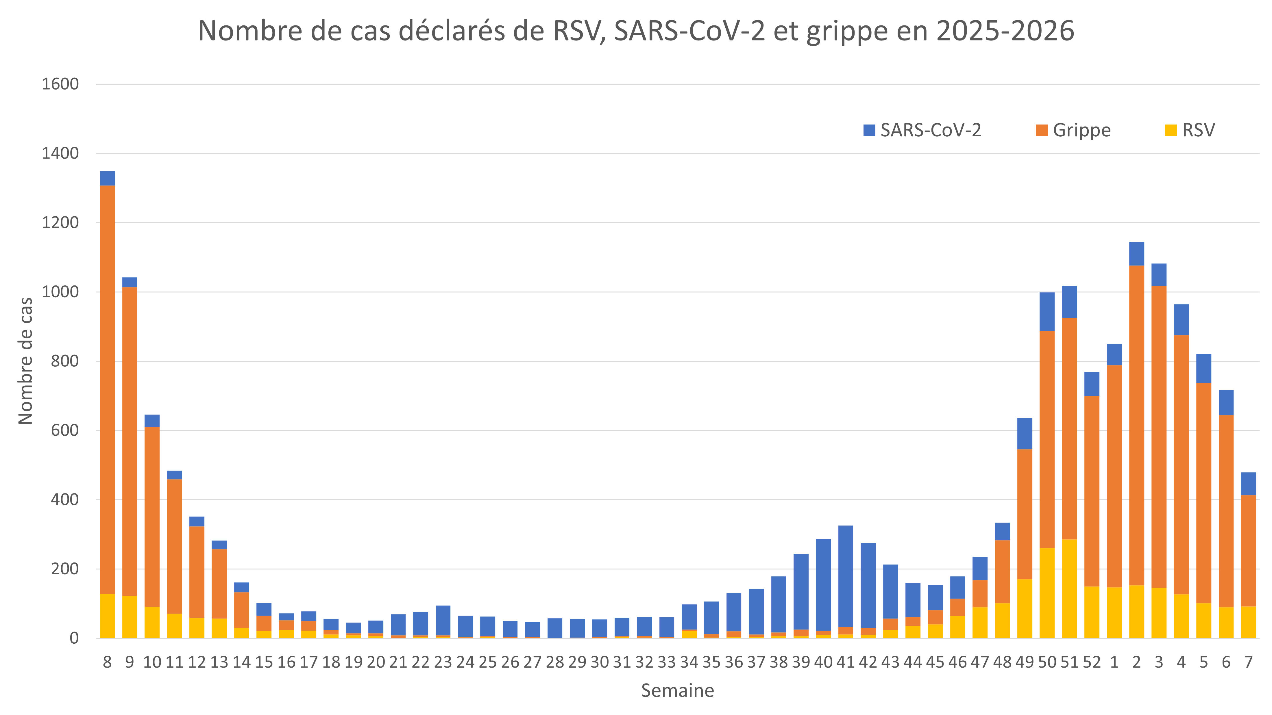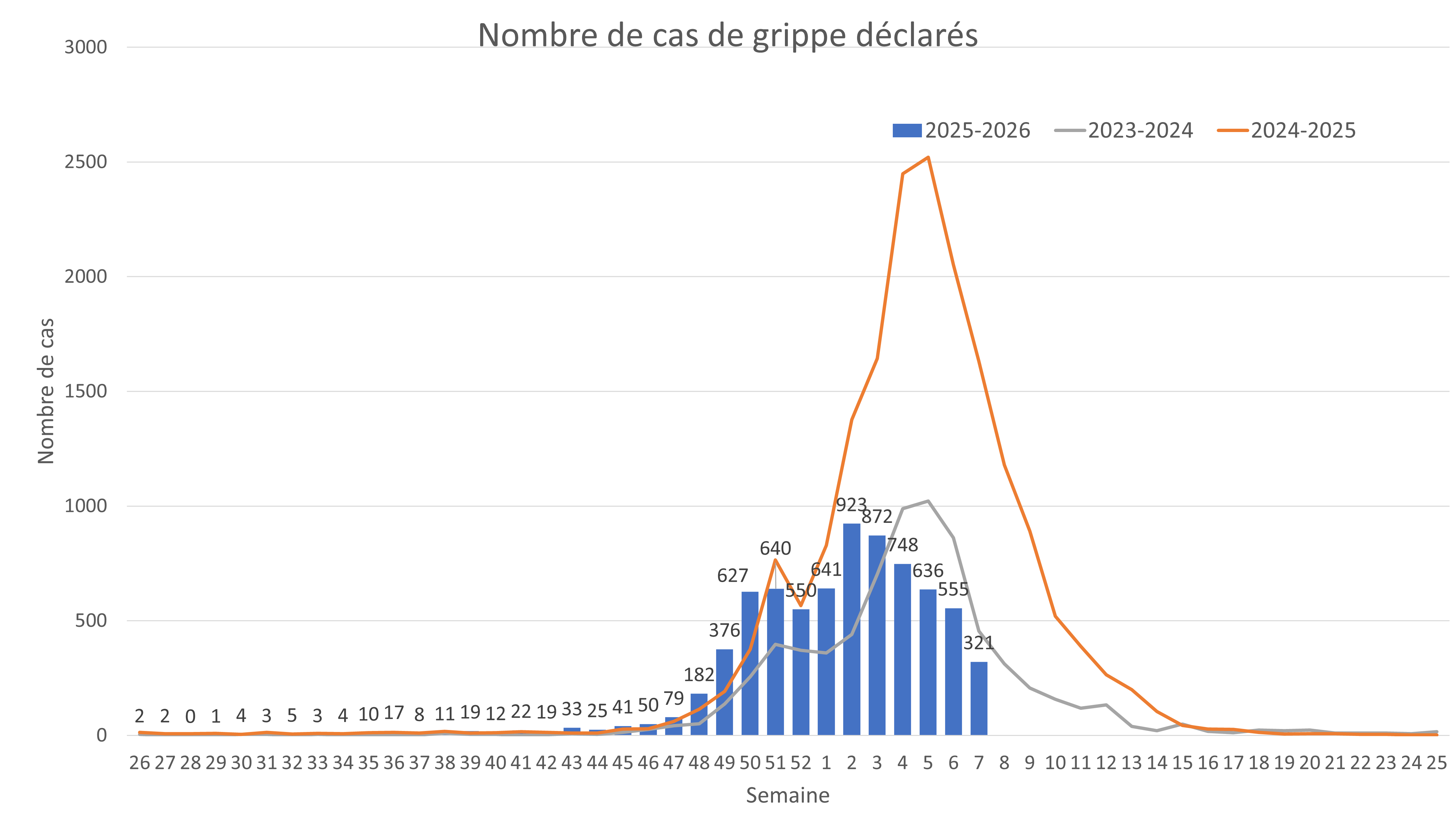Au cours de la semaine 7, du 9 au 15 février 2026, le nombre de cas de grippe déclarés par les laboratoires a diminué passant de 555 à 321 cas, soit une baisse de 42% par rapport à la semaine précédente. C'est la cinquième semaine consécutive de recul, avec une circulation du virus qui continue de diminuer.