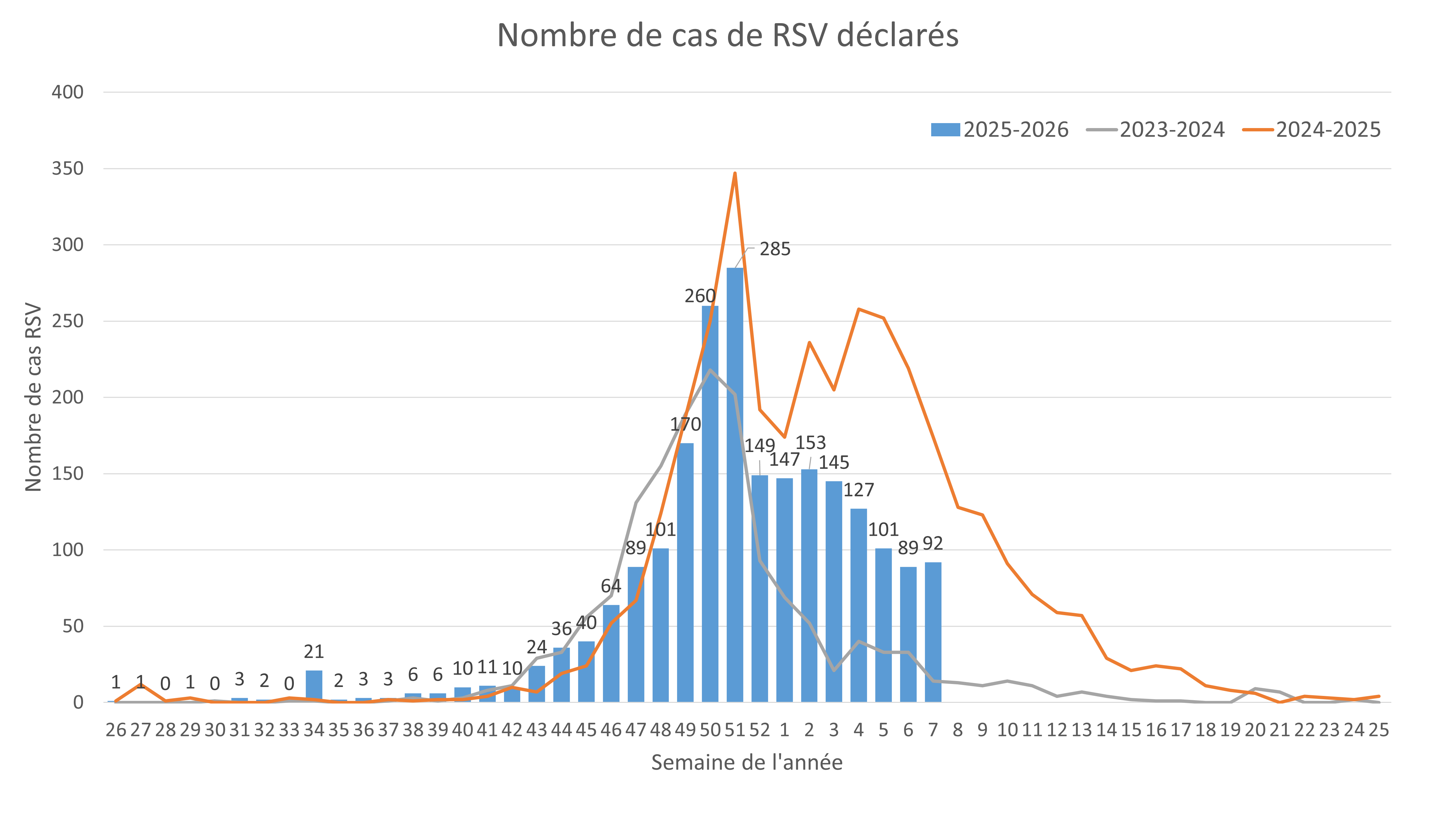Pour le RSV, une légère augmentation de 3% a été observée, avec 92 cas confirmés, contre 89 la semaine précédente. Depuis octobre 2025, 55% des infections concernent des enfants de moins de dix ans, ce qui indiquerait que le virus touche principalement les plus jeunes.