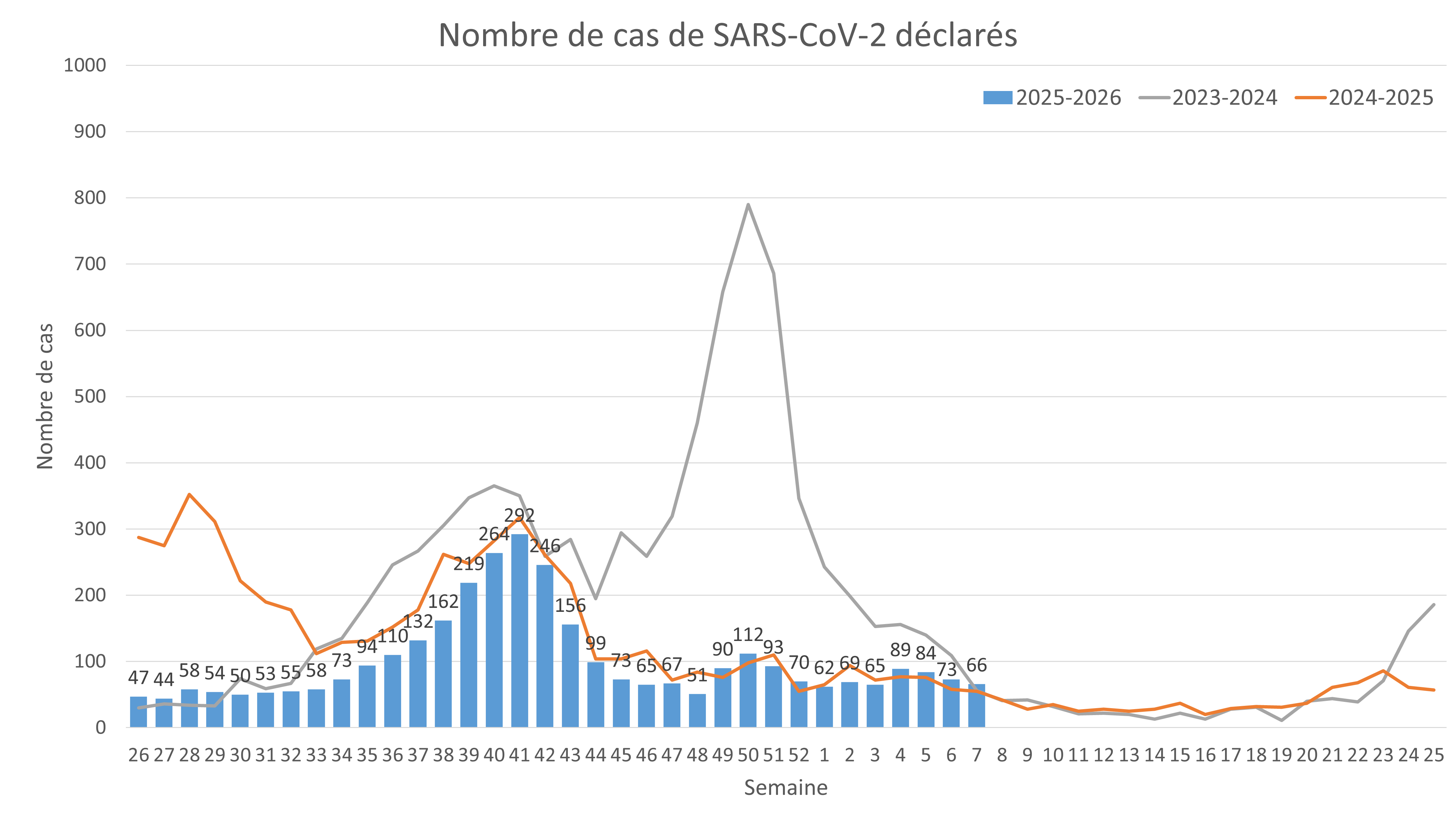 Au cours de la semaine 7, du 9 au 15 février 2026, le nombre de cas positifs au SARS-CoV-2 diminue, passant de 73 à 66 cas, soit une diminution de 10% par rapport à la semaine précédente.