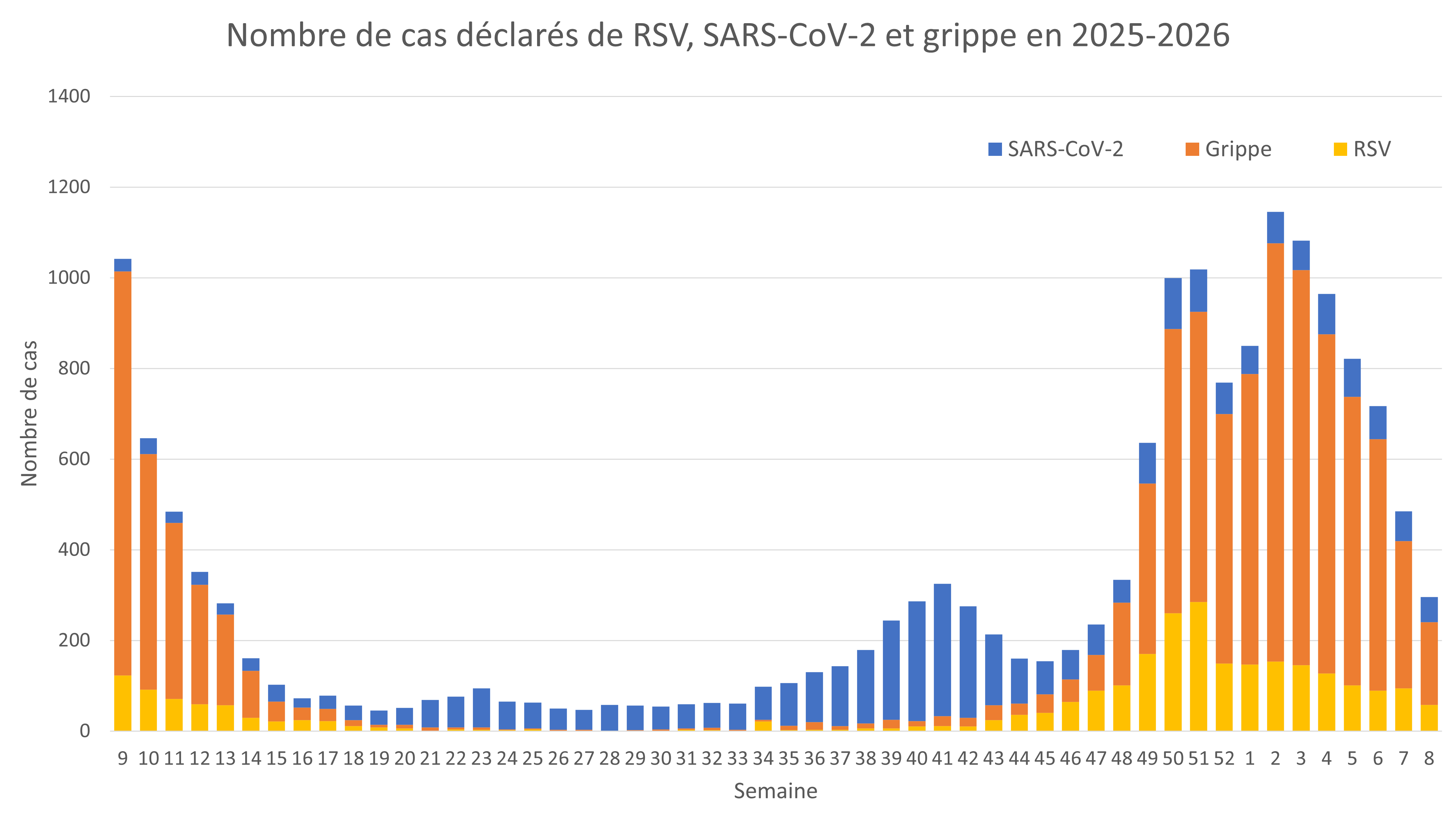 Pour le RSV, une diminution de 38% a été observée, avec 58 cas confirmés, contre 94 la semaine précédente. Depuis octobre 2025, 54% des infections concernent des enfants de moins de dix ans, ce qui indiquerait que le virus touche principalement les plus jeunes.
