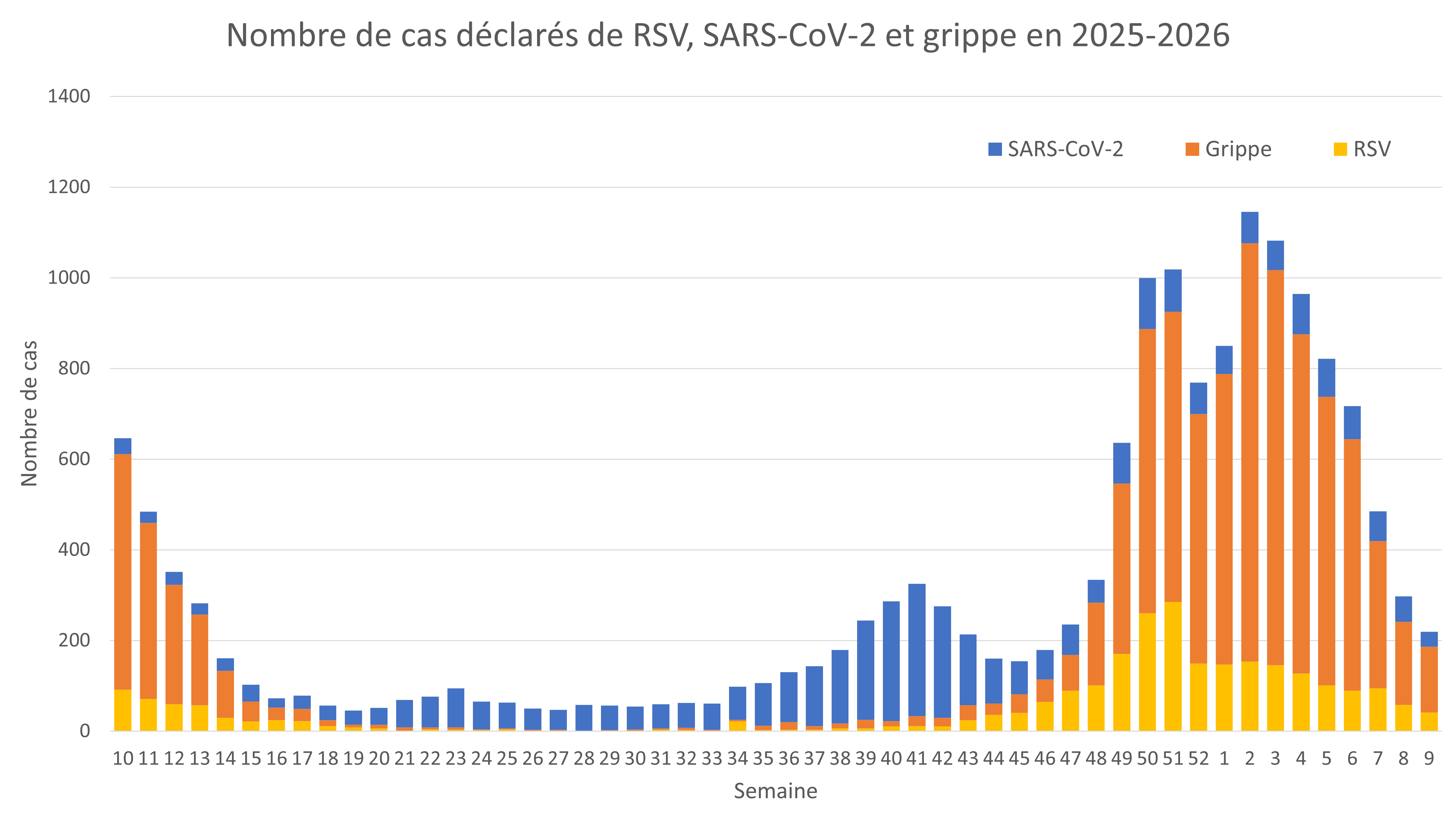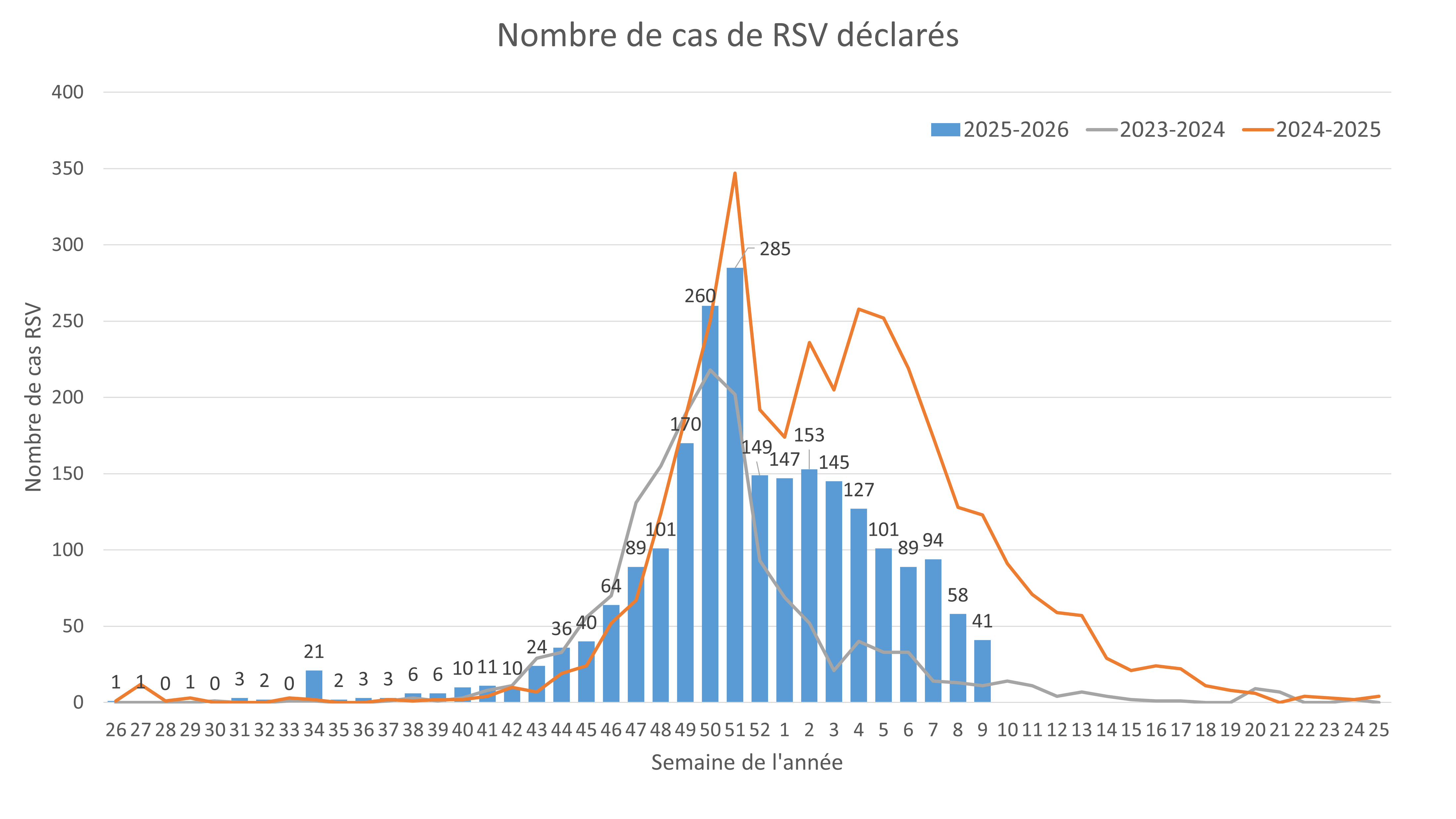 Pour le RSV, une diminution de 29 % a été observée, avec 41 cas confirmés, contre 58 la semaine précédente. Depuis octobre 2025, 54 % des infections concernent des enfants de moins de dix ans, ce qui indiquerait que le virus touche principalement les plus jeunes.