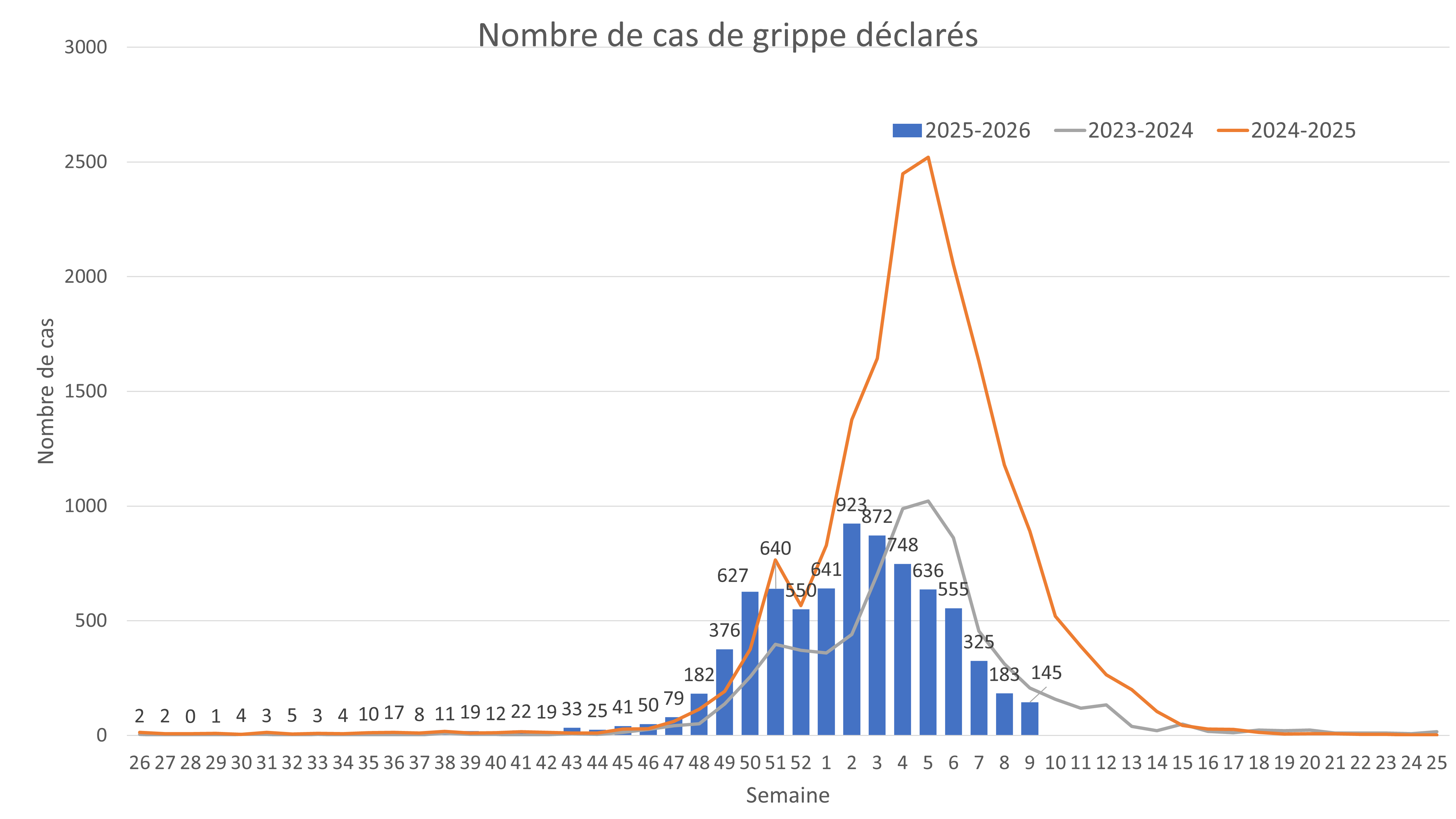 Au cours de la semaine 9, du 23 février au 1er mars 2026, le nombre de cas de grippe déclarés par les laboratoires a diminué passant de 183 à 145 cas, soit une baisse de 21 % par rapport à la semaine précédente. C’est la septième semaine consécutive de recul, avec une circulation du virus qui continue de diminuer.