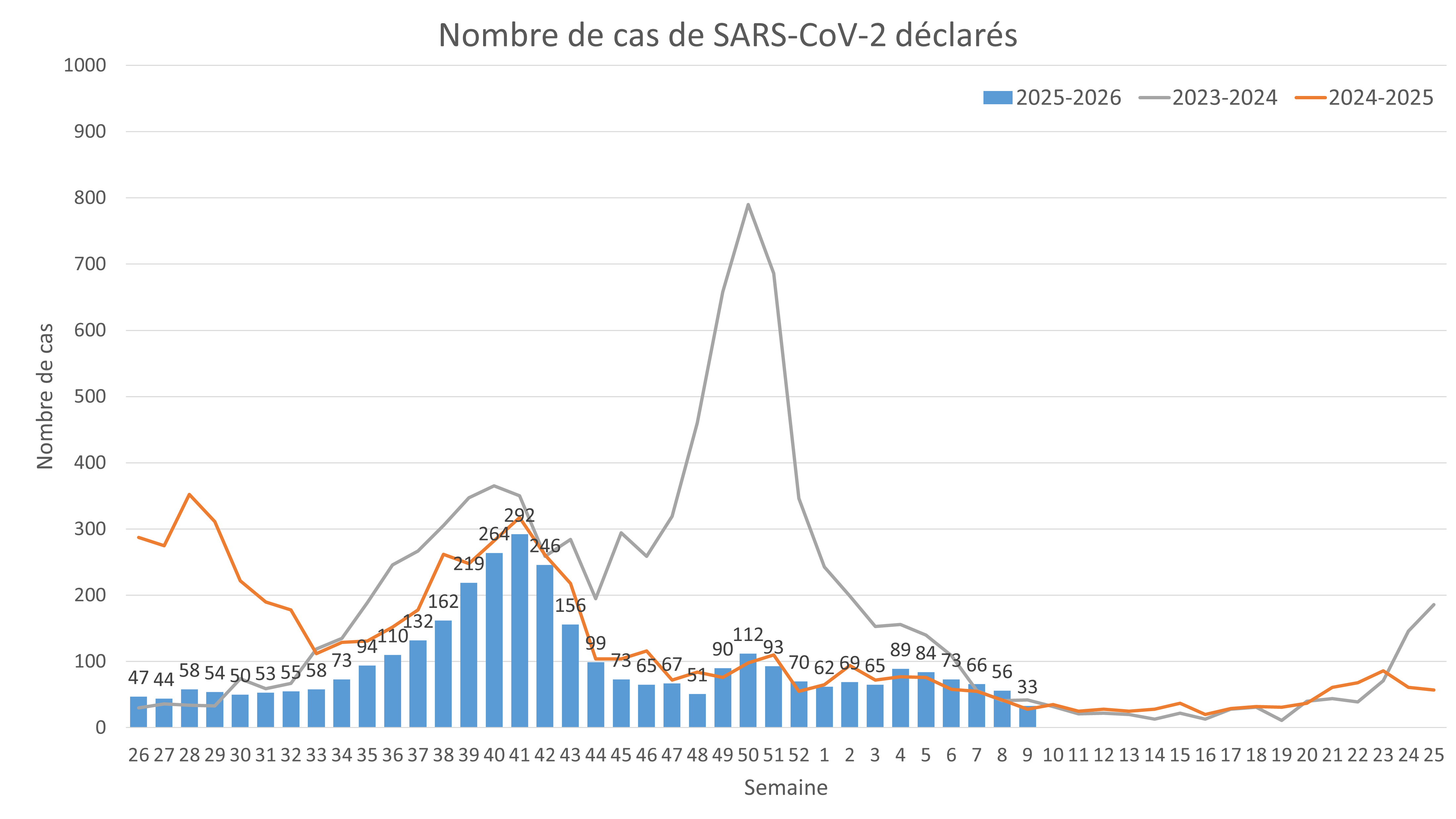 Au cours de la semaine 9, du 23 février au 1er mars 2026, le nombre de cas positifs au SARS-CoV-2 diminue, passant de 56 à 33 cas, soit une diminution de 41 % par rapport à la semaine précédente.