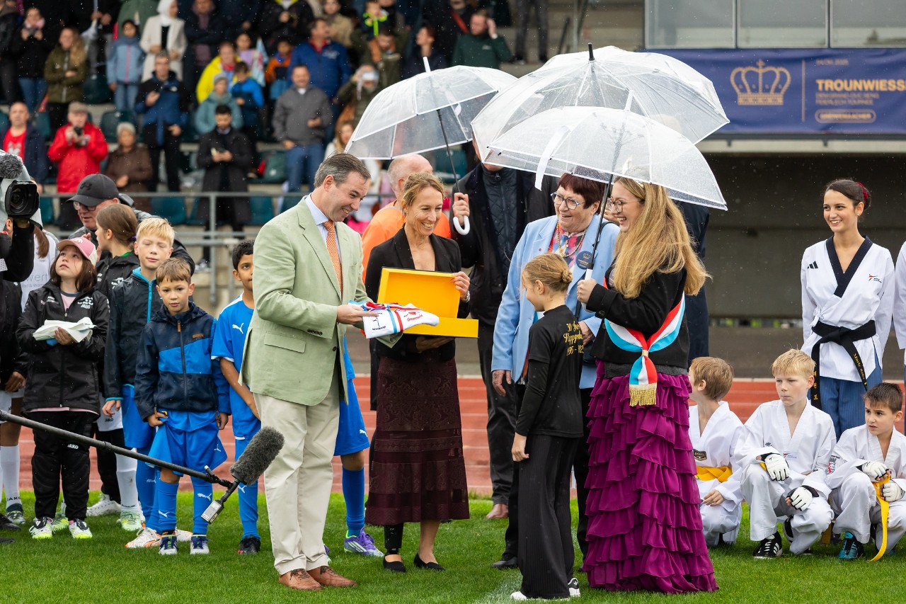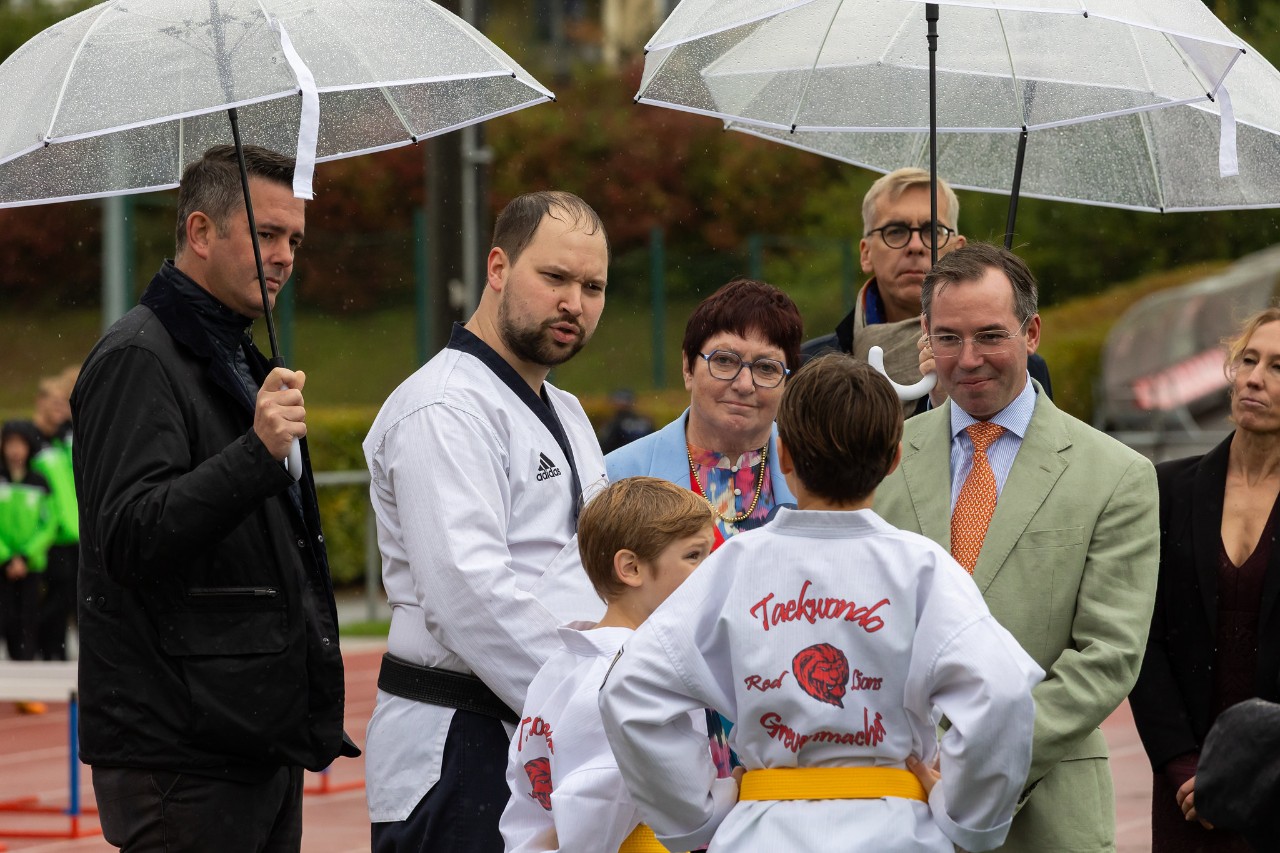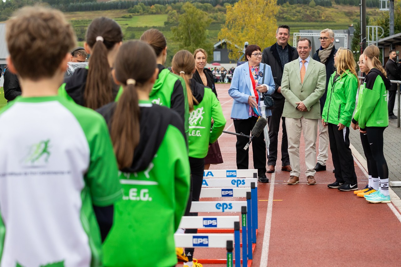 Visite de S.A.R. le Grand-Duc, en présence du ministre de l'Économie, des PME, de l'Énergie et du Tourisme, Lex Delles, et du ministre des Affaires intérieures, Léon Gloden, du stade ''Op Flohr'' qui se déroule sous le thème: "Le sport comme vecteur pour mettre en valeur le bénévolat". Les femmes et les hommes investis dans le bénévolat ainsi que la promotion des sports et des sportifs sont à l'honneur.