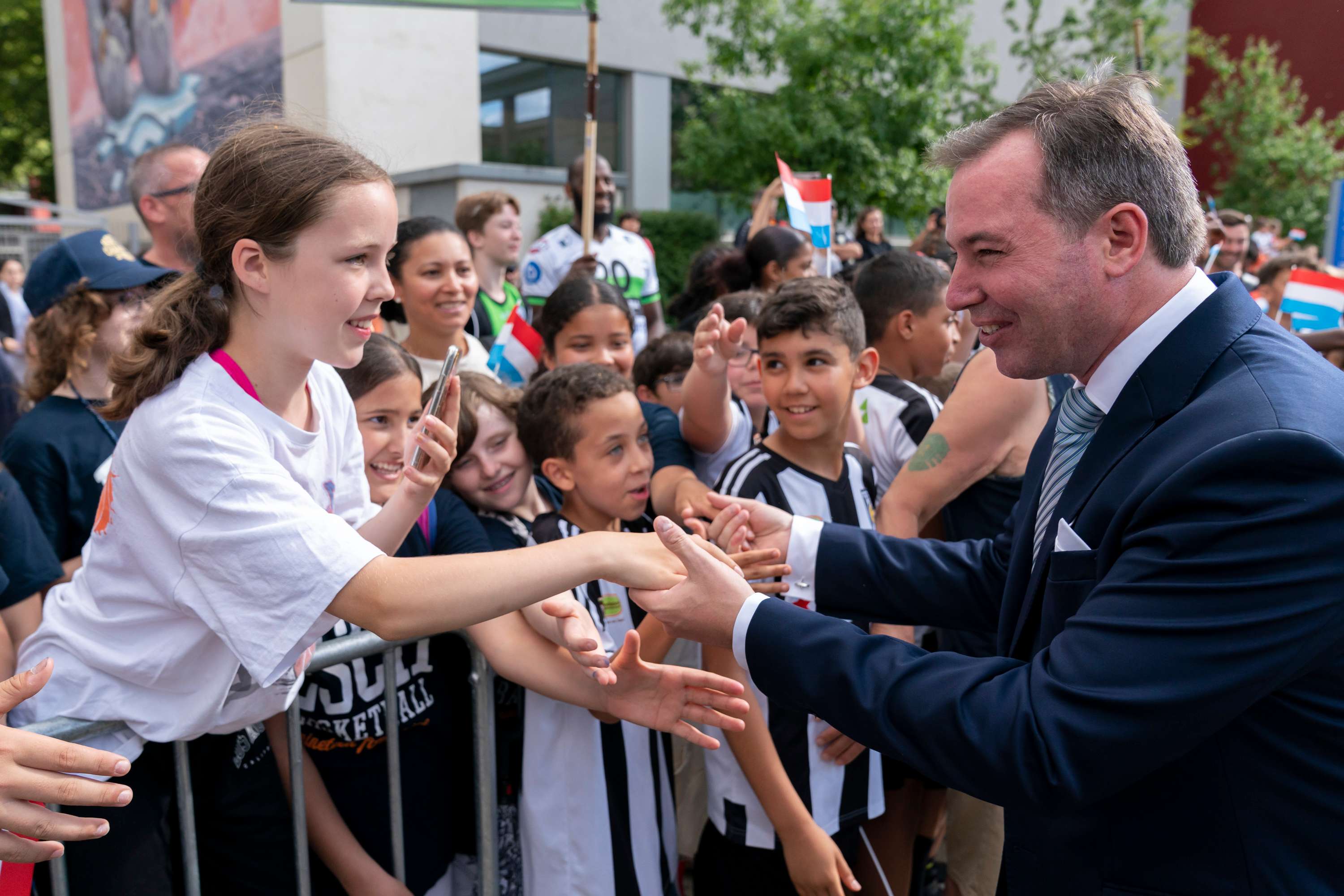 Den Ierfgroussherzog gëtt op der "Place de la Résistance" vum Vize-President vun der Chamber Mars Di Bartolomeo, der Inneministesch a Ministesch fir Gläichstellung tëschent Fraen a Männer Taina Bofferding, dem Sportsminister, Minister fir Aarbecht a Beschäftegung a fir Sozial- a Solidarwirtschaft Georges Engel, der Ministesch fir Ëmwelt, Klima an nohalteg Entwécklung Joëlle Welfring, dem Minister fir Famill an Integratioun, Minister fir d'Groussregioun, Max Hahn, souwéi vum Escher Buergermeeschter an Deputéierte Georges Mischo an dem Schäffen- a Gemengerot vun Esch-Uelzecht empfaangen.